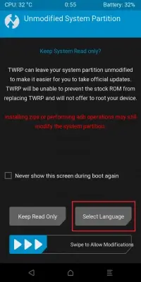 - В TWRP, нажав на правую плитку, выбираем язык Русский и проводим свайп для подтверждения изменений в системном разделе;