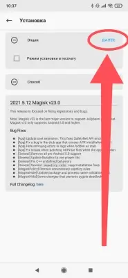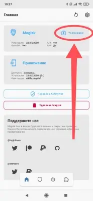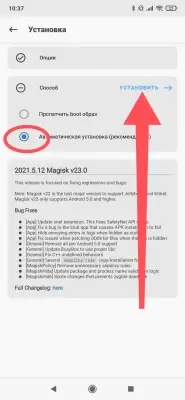 - Запускаем Magisk и нажимаем на кнопку Установка -> Далее -> Автоматическая установка -> Установить: