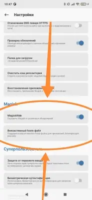 - Выполняем дополнительную настройку, запускаем Magisk -> Настройки, включаем MagiskHide и Внесистемный hosts файл, после, перезагружаем смартфон: